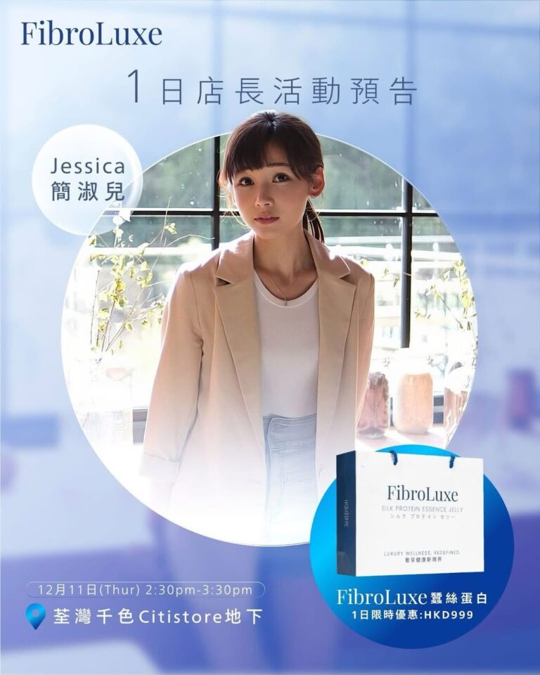 人氣女神 Jessica 簡淑儿 將以一日店長身份,親臨荃灣千色Citistore,與您分享 Fibroluxe 品牌的魅力。Fibroluxe煥顏蠶絲膠蛋白,經由國際權威檢測機構 CMA Testing 嚴格檢測,榮獲最高標準的 「A+認證」。
